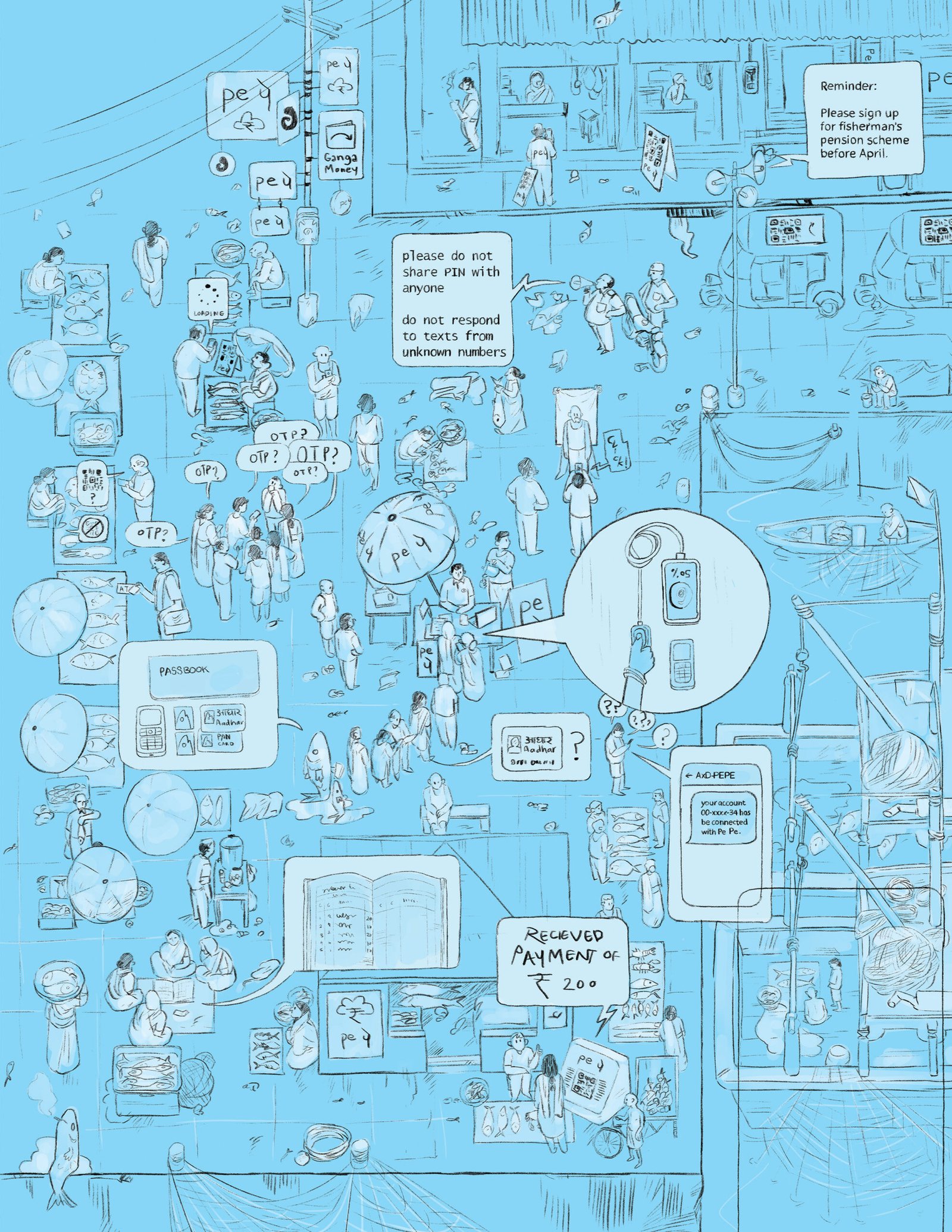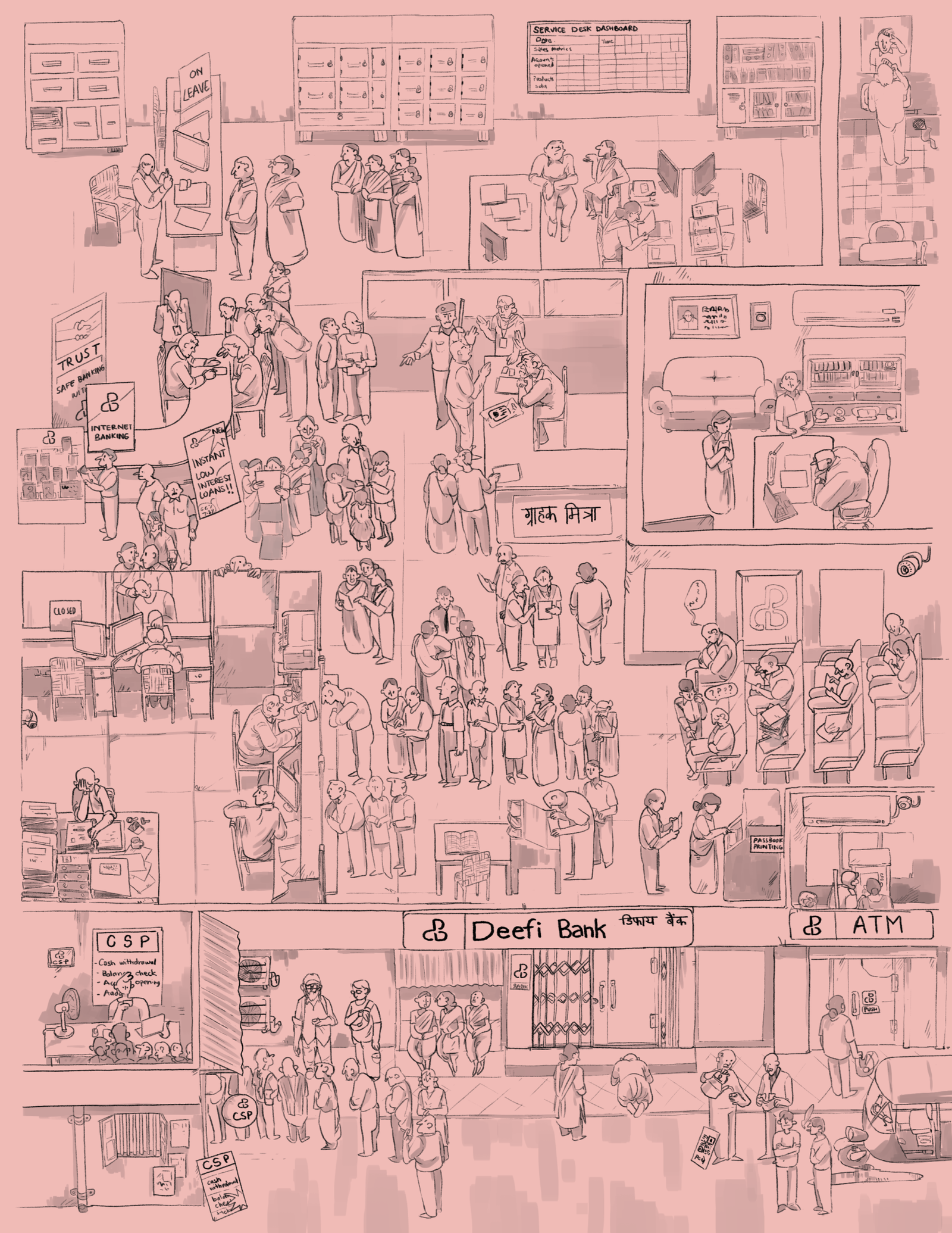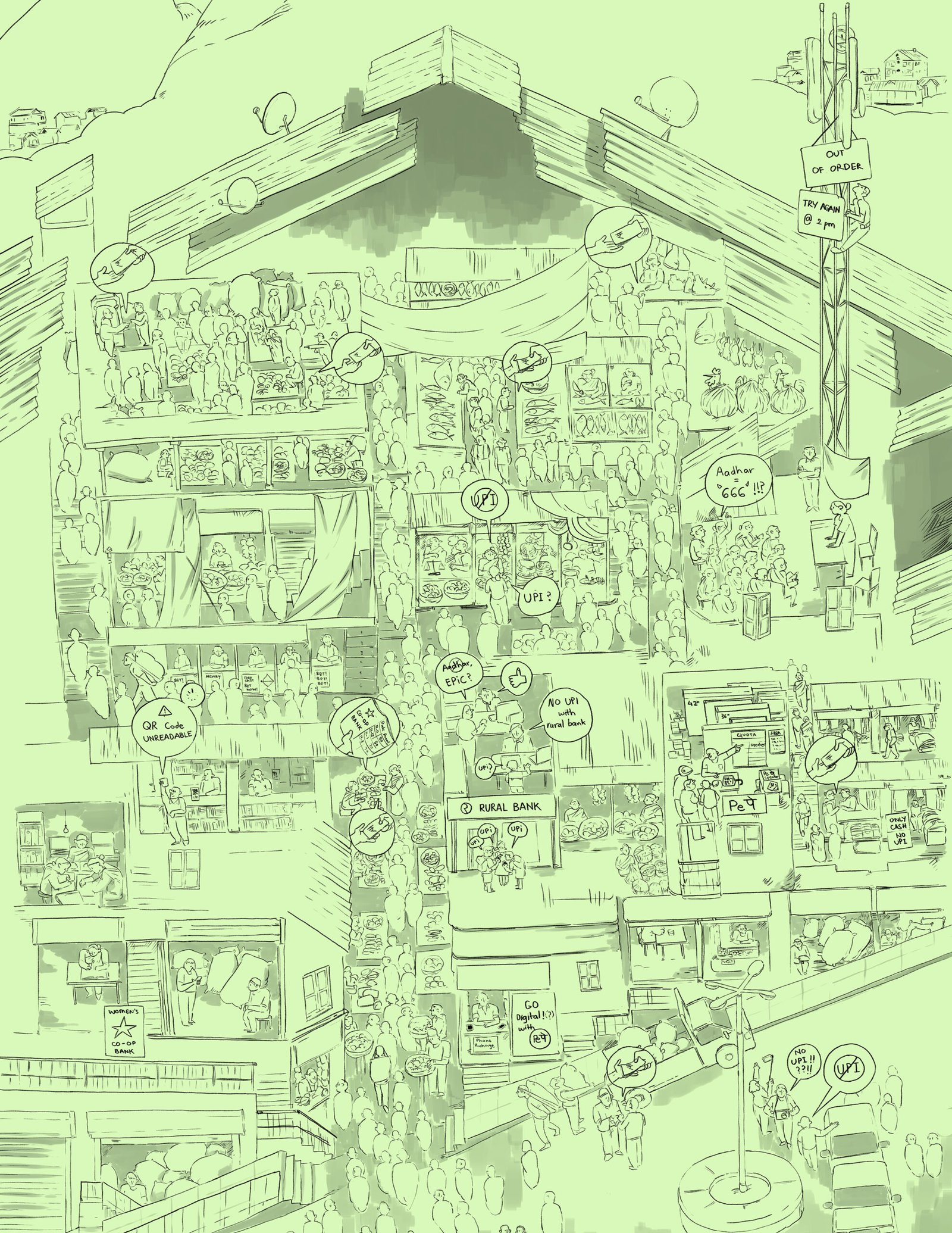 These illustrations were made based own the field experience we had while conducting the research. They are inspired by the fish market in Vizag, Bara Bazaar, the central market of Shillong and a combination of small banks across the states of Uttar Pradesh and Andhra Pradesh. They attempt to highlight some of the observations that were made regarding banaking and digital finance services in tier 2 and tier 3 and rural areas of the country.
